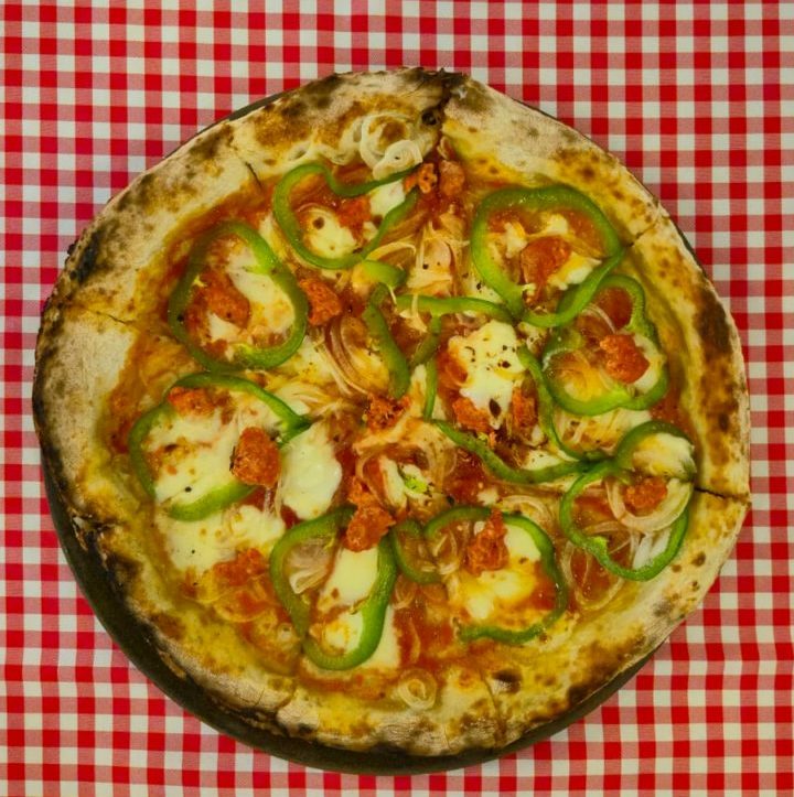 Pizza with tomato sauce, mozzarella, green peppers, onions and merguez (North African spicy chicken sausage)